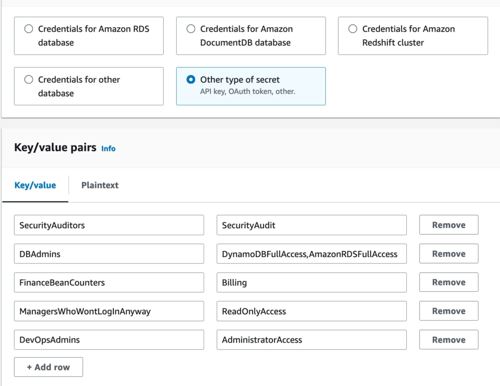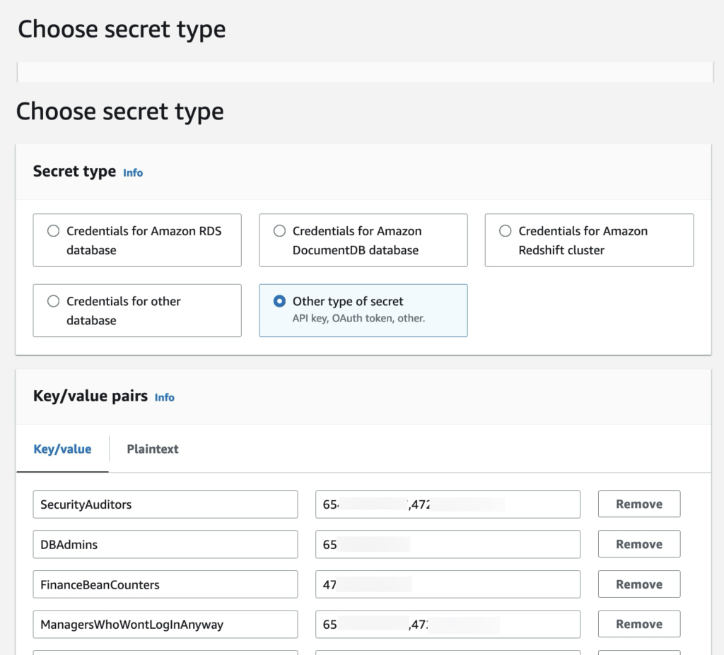One more set of secrets so that we can now try to implement the logic that AWS failed to; really what I'd like to do is know "which groups should get these permissions", so let's make some mapping for that under /aws/org/sso/group-mapping still using the Permission Set name as the key