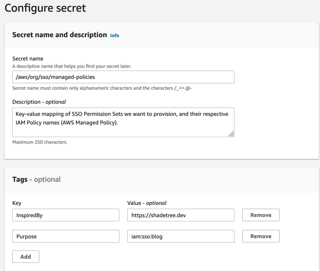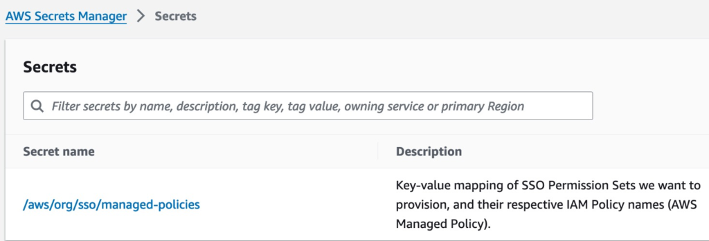 I recommend saving this to a path like /aws/org/sso/managed-policies. This gives you a prefix to work off for any custom policies you want to keep in a separate secret, for instance (more on this later).